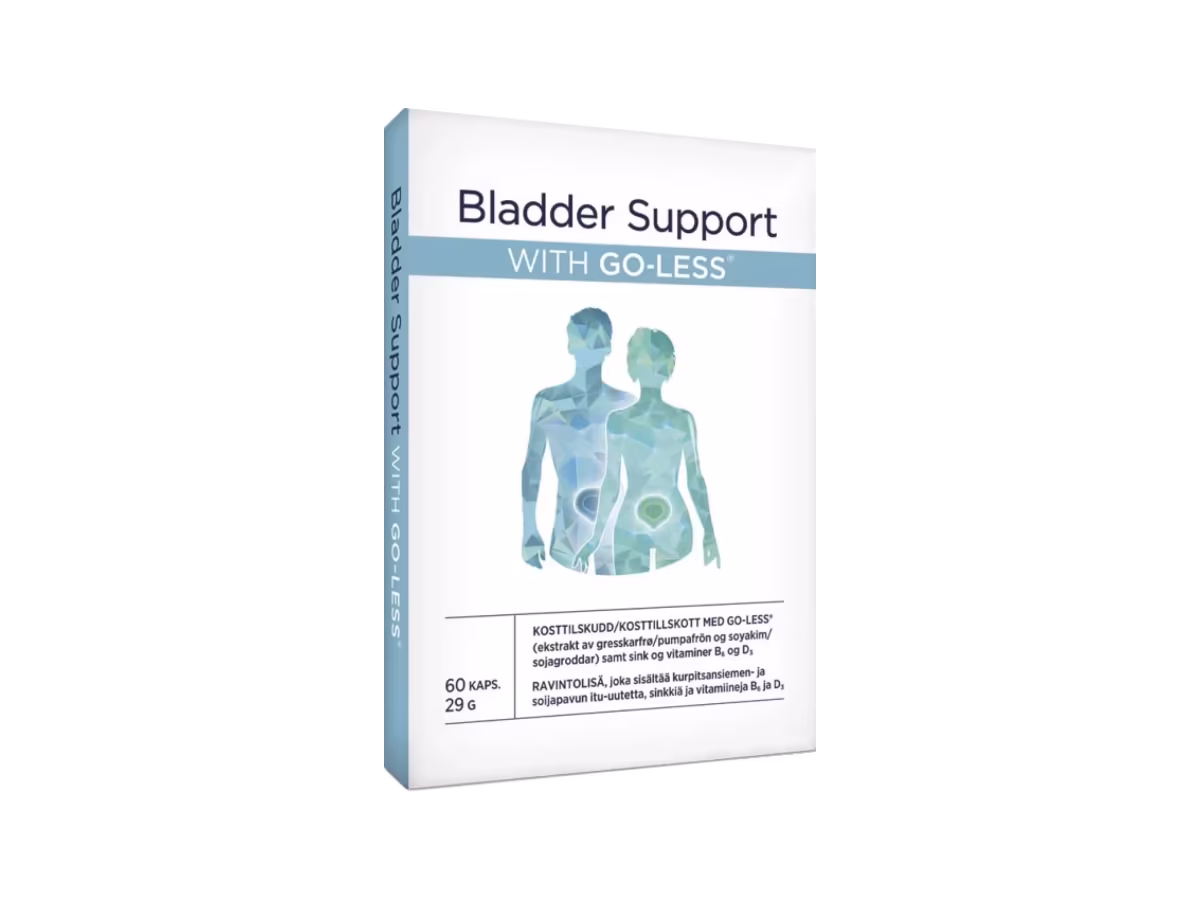 Prøv Bladder Support with Go-Less® i 30 dager – et kosttilskudd for voksne med gresskarfrøekstrakt, vitamin B6, vitamin D3 og sink.