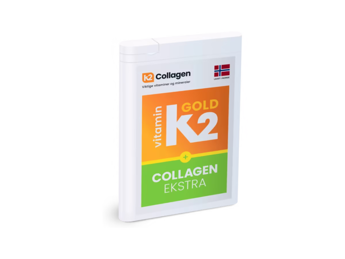 Prøv K2Collagen i 60 dager – et kosttilskudd utviklet for voksne, med en nøye sammensatt formel som inkluderer: kollagen, vitamin K2, C, D, kalsium, magnesium og mangan.