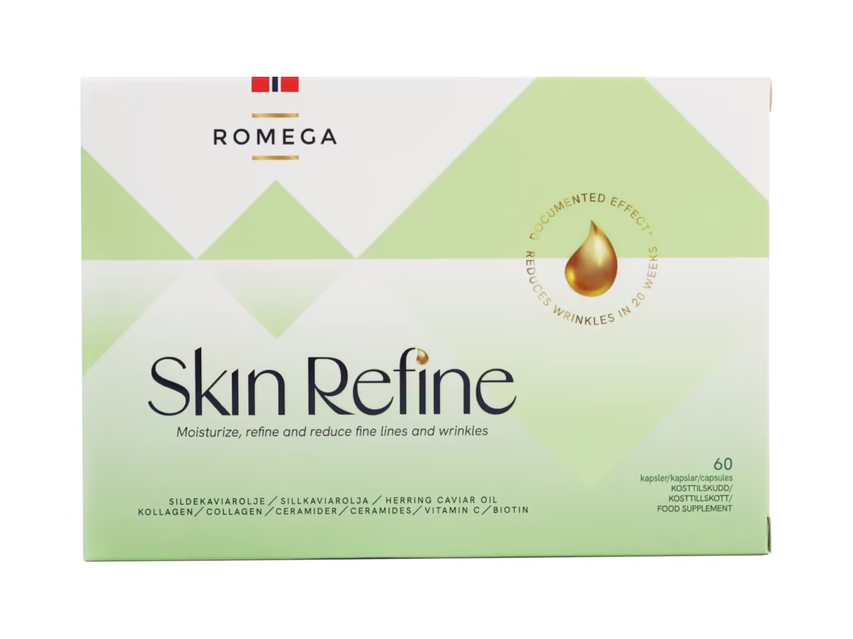 Prøv Romega® SKIN REFINE i 30 dager – et kosttilskudd med marint kollagen, hveteceramider, sildekaviarolje og utvalgte vitaminer, laget for enkel daglig bruk.